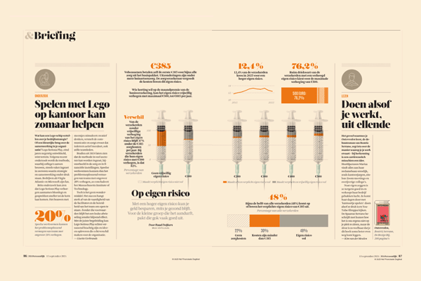 Voor FD Persoonlijk, het stijlvolle weekendmagazine van het Financieele Dagblad, maak ik wekelijks een infographic over thema’s rond werk en geld – van goed werkgeverschap en belastingzaken tot financiële steun van ouders aan kinderen. Ik volg relevante ontwikkelingen voor FD-lezers en vertaal statistische data samen met vormgevers naar heldere, visueel sterke infographics.